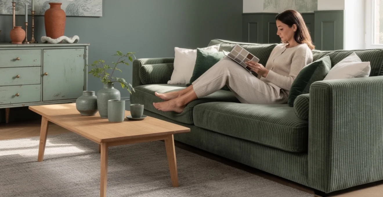 Le mobilier rembourré constitue l’un des supports les plus efficaces pour adopter la couleur vert de gris sans engager de travaux lourds. Un canapé en velours côtelé vert de gris, par exemple, devient immédiatement la pièce maîtresse du salon. La profondeur de la couleur se trouve renforcée par le jeu d’ombre et de lumière sur les côtes du velours, offrant une assise à la fois graphique et réconfortante. Placé sur un tapis clair, entouré de bois naturels et de quelques touches de noir, il incarne parfaitement l’élégance contemporaine.