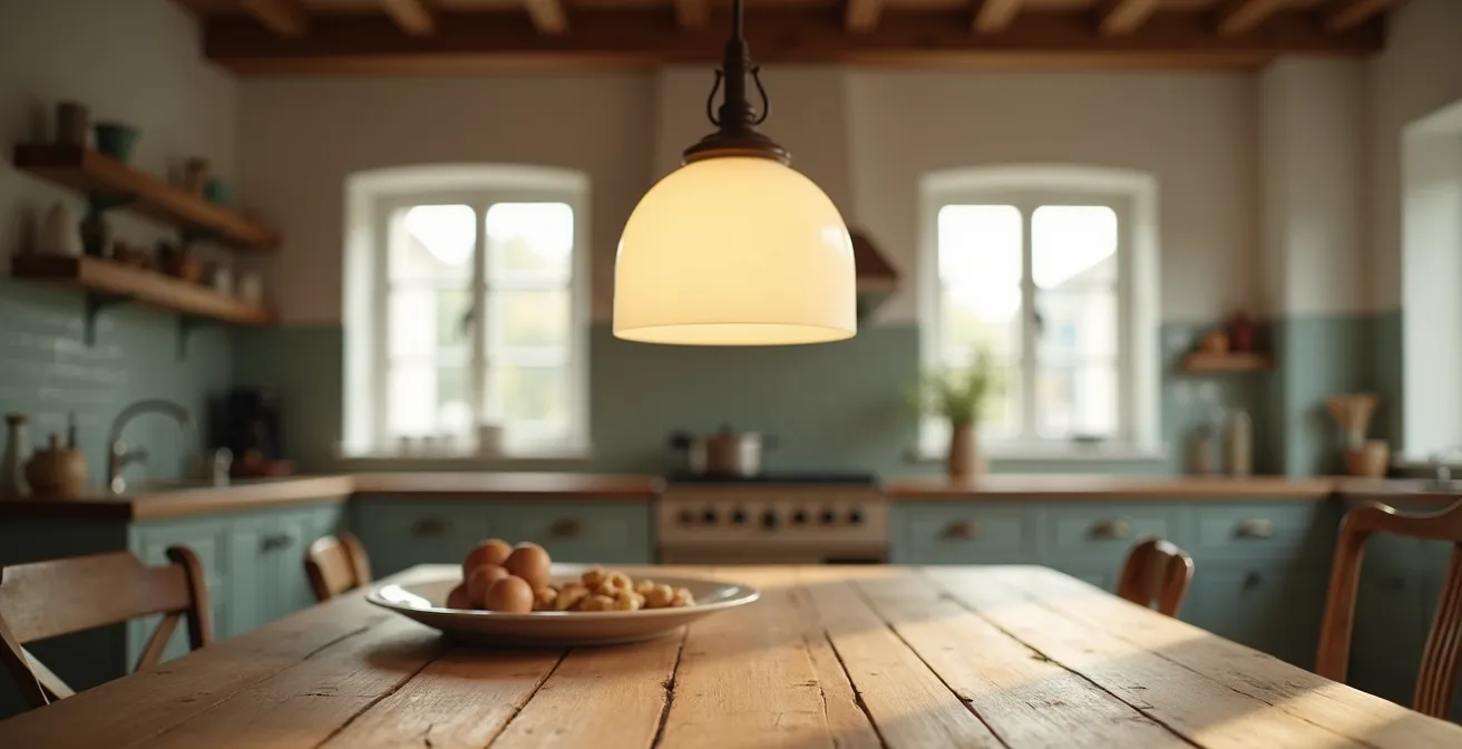Dans la cuisine, souvent cœur battant de la maison, un alignement de trois suspensions en opaline au-dessus d’un îlot central crée un point focal à la fois pratique et chaleureux. La lumière diffuse est idéale pour préparer les repas sans être ébloui, tout en baignant l’espace d’une convivialité douce. Le blanc laiteux des globes contraste magnifiquement avec des matériaux modernes comme le bois brut ou le métal noir, prouvant que l’opaline n’est pas prisonnière du passé.