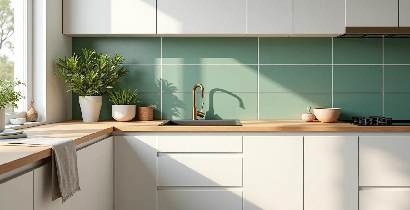 - Le vert sauge : Apaisant et naturel, il crée une atmosphère fraîche et sereine. Il s’associe magnifiquement avec des détails en laiton et des plans de travail en bois clair.