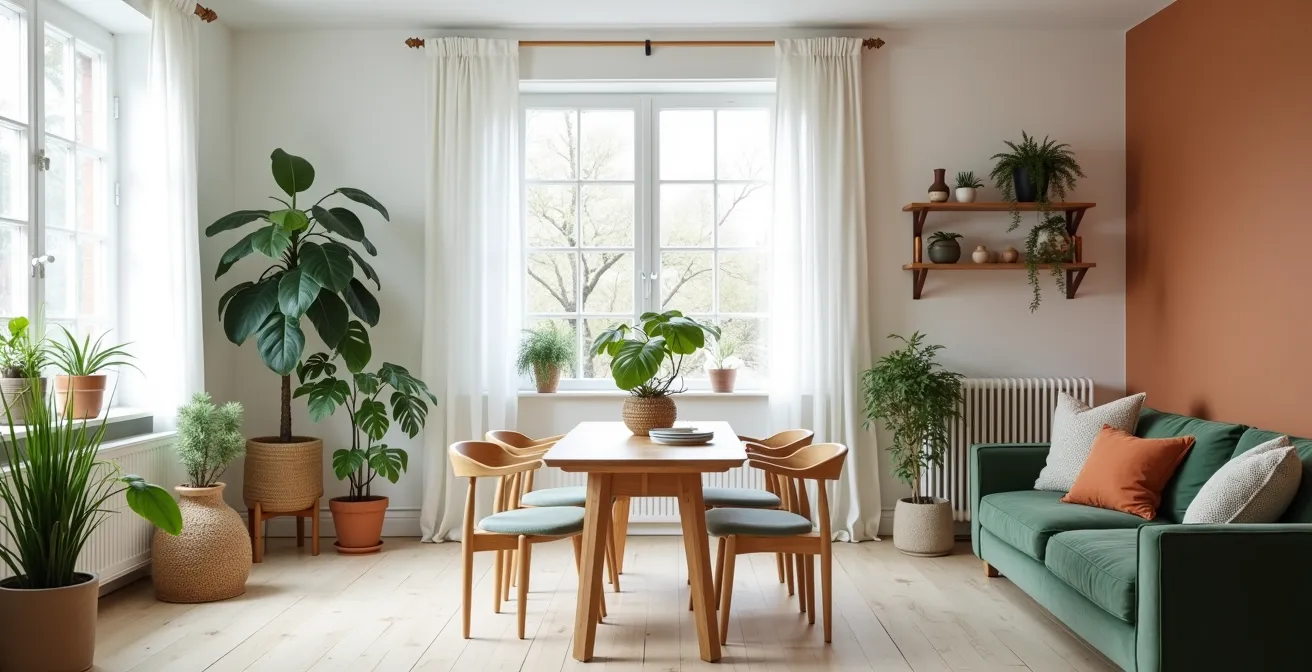 La connexion à la nature est l’essence même du style de vie et du design scandinave. Ce n’est pas juste une question de mettre quelques plantes vertes. C’est une approche globale, aujourd’hui théorisée sous le nom de design biophilique : l’idée que l’être humain a un besoin inné d’être en contact avec la nature pour son bien-être. Un intérieur scandinave cherche donc à brouiller les frontières entre l’intérieur et l’extérieur. Cela se traduit par l’utilisation de matériaux naturels bruts (bois, pierre, cuir, lin), de formes organiques inspirées du vivant, et bien sûr, par l’intégration abondante de la végétation.