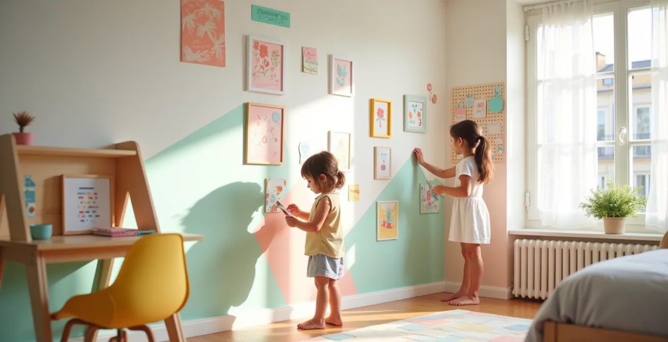 Et si on arrêtait de voir le mur comme une simple surface à couvrir, mais plutôt comme une scène de jeu, une galerie d’exposition personnelle et évolutive ? L’idée n’est plus de « décorer » au sens classique, mais bien de « scénographier » un espace qui raconte l’histoire de votre enfant, au jour le jour. Il ne s’agit plus de faire des choix définitifs, mais de mettre en place un support d’expression qui grandira et se transformera avec lui. C’est une approche qui valorise sa créativité, stimule son autonomie et transforme sa chambre en un cocon unique qui lui ressemble vraiment, à chaque étape de son développement.