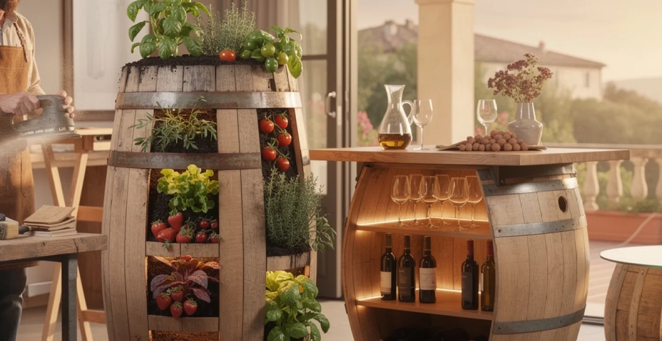 Qu’il soit transformé en jardinière, en bar ou en meuble d’appoint, le tonneau en bois de chêne déploie tout son potentiel lorsqu’il est harmonieusement intégré au paysage extérieur. Dans un jardin d’inspiration méditerranéenne, il s’accorde naturellement avec les oliviers en pot, la lavande, le romarin et les dallages en pierre claire. Disposez quelques tonneaux de hauteurs différentes, certains entiers, d’autres coupés en moitié, pour créer un rythme visuel rappelant les cours de domaines viticoles du sud de la France.