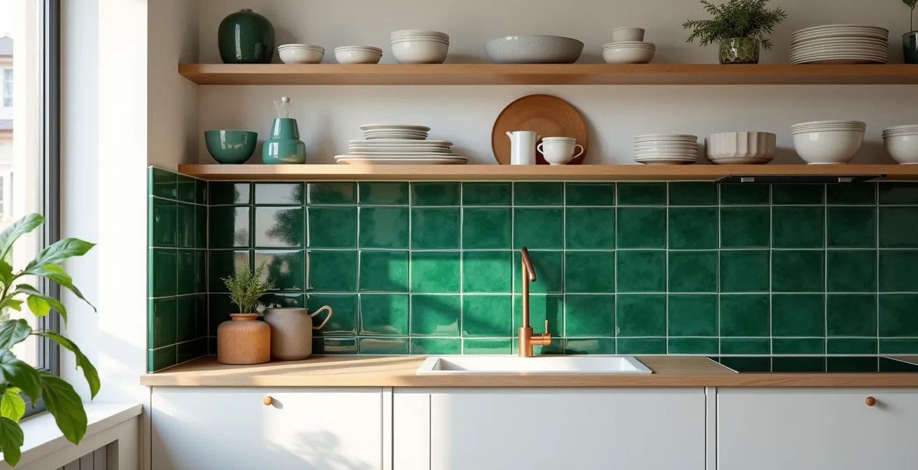 Le jeu de lumière unique du zellige est particulièrement efficace dans une cuisine blanche. La surface brillante et nuancée des carreaux capte la lumière naturelle et artificielle, la réfléchit de manière inégale et fait danser les couleurs. Un zellige vert d’eau, bleu céladon ou même un blanc nacré apportera une profondeur et une subtilité qu’aucune autre faïence ne peut offrir. Comme le soulignent les experts, le zellige est parfait pour une crédence de cuisine, ajoutant instantanément de la personnalité et du caractère.